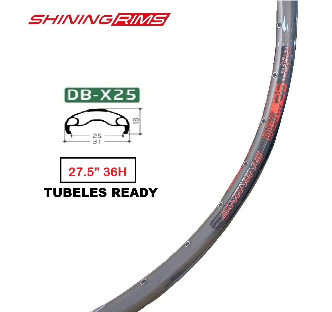 Aros Shining DB-X25 27.5″ 36H Tubeles Ready Presta Taiwan (Unidad)